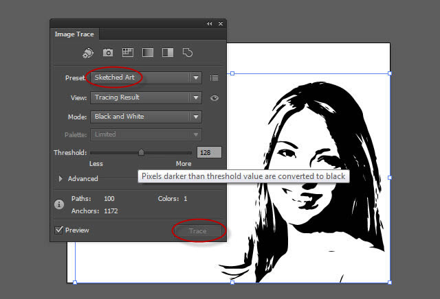 第五步:点击左上方的"图像描摹"图标,选择描摹方式后,在弹出的预设面板中可进一步调整预设参数。