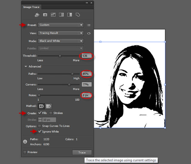 第六步:让我们将图像描摹应用于图像,在这里我用的图像描摹预设为"低保真相片"。
