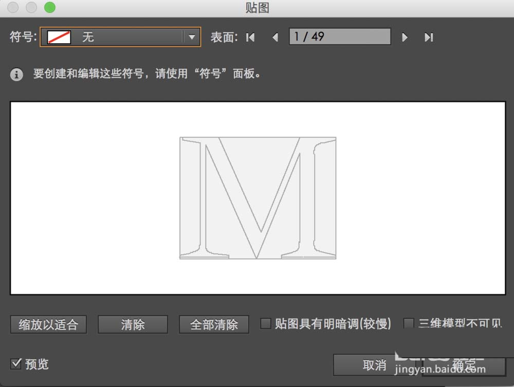 7、在凸出和斜角面板中,勾选左下角的“预览”,可以实时看到参数设置的效果,点击贴图,在贴图面板可以看到字体的每个面,在符号下拉中可以选择刚刚创建的矩形符号。