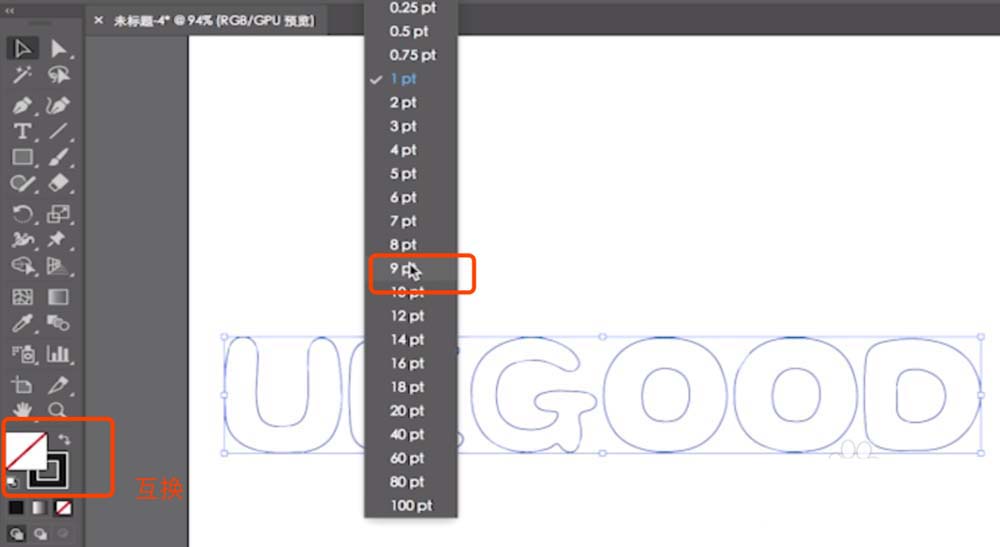 8、然后填充和描边互换,调节描边尺寸为9pt。
