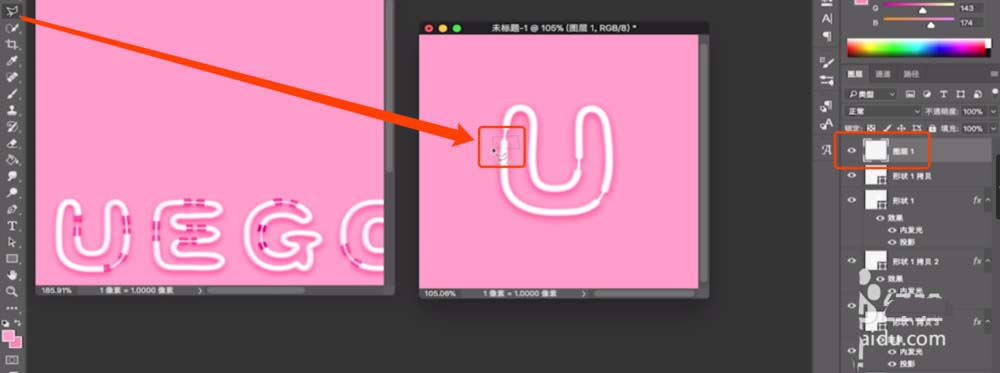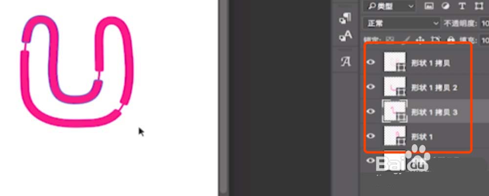 19、选中二个U字体,Ctrl+C复制,粘贴到PS中,弹出选框,选择形状图层,确定。