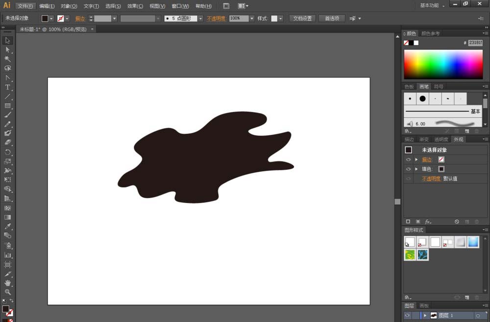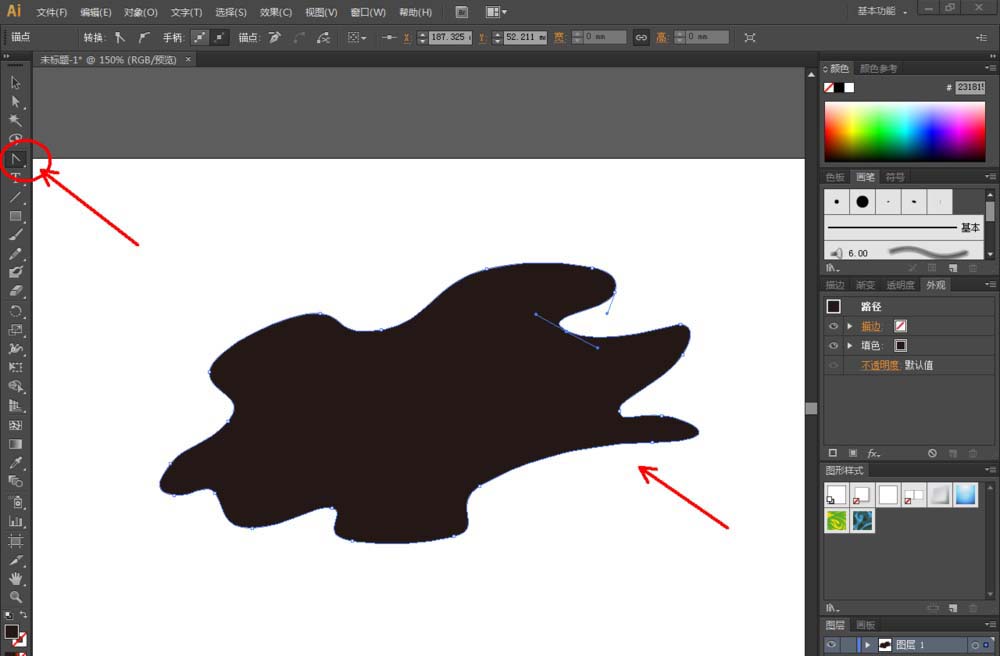 1、打开Adobe Illustrator CS6软件,点击【钢笔工具】绘制一个自定义图案。点击【转换锚点工具】对图案上的节点进行平滑圆化处理;