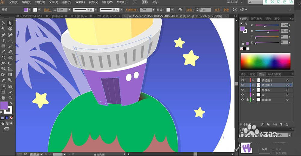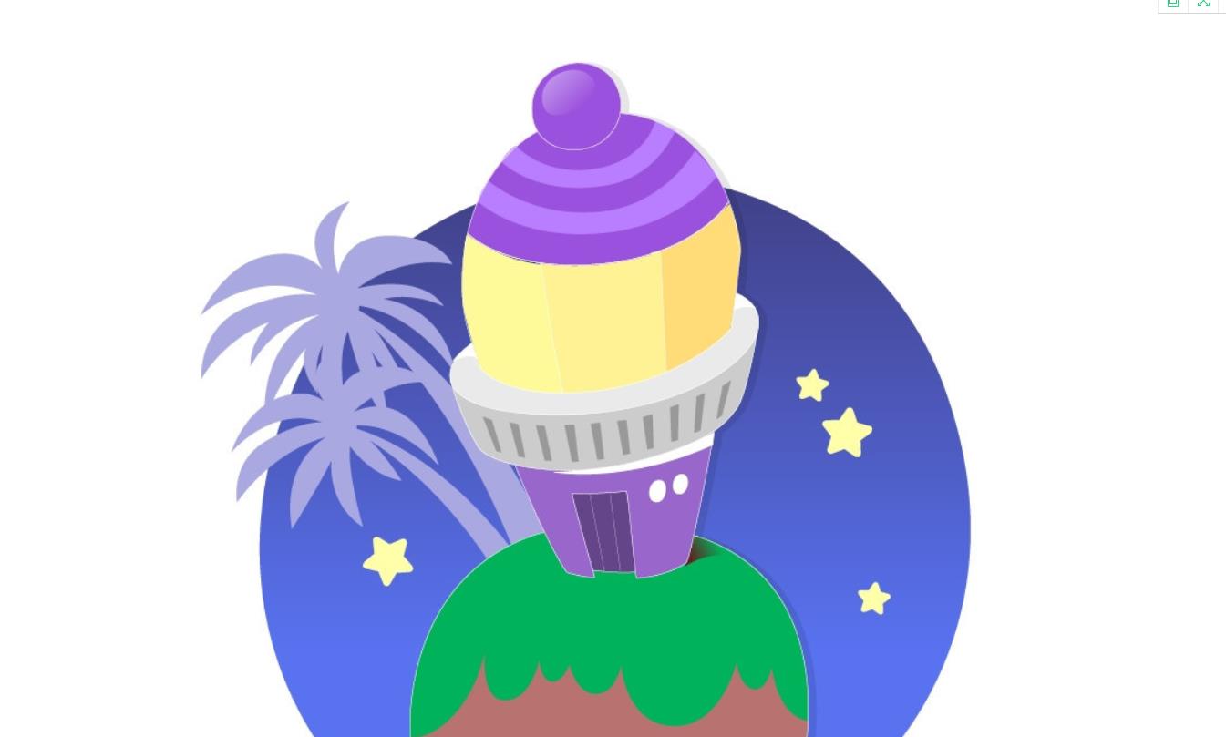 7、最后,我们用更浅的蓝紫色填充小楼的顶端结构,再用白色的渐变填充小楼顶端的高光路径,完成海岛图标设计。