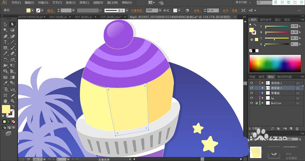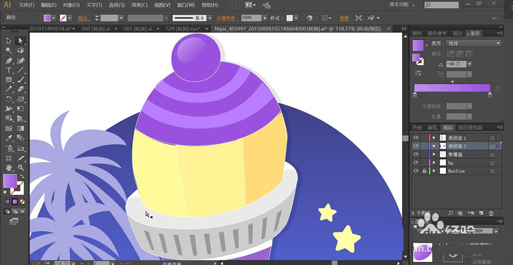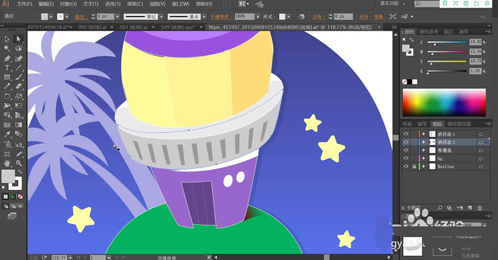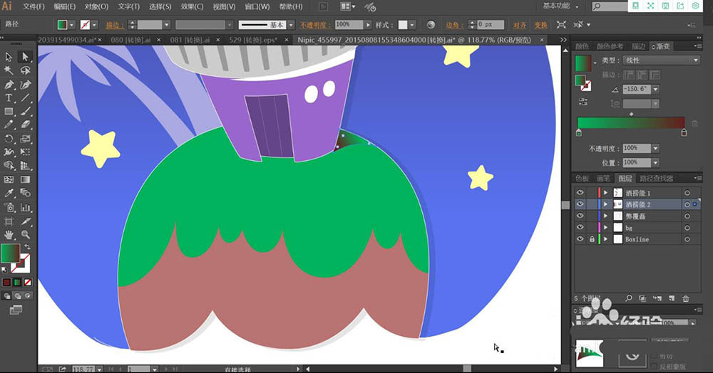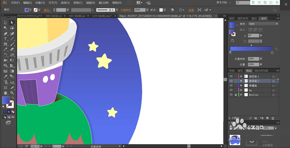 2、使用蓝色的渐变填充天空所在圆形路径,再用黄灰色填充星星的路径。