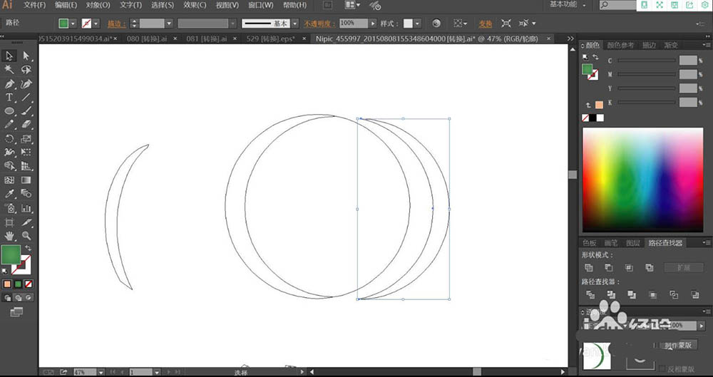 1、使用圆形工具画出两个圆形,再用路径查找器进行裁剪从而得到不同形状的圆弧路径。