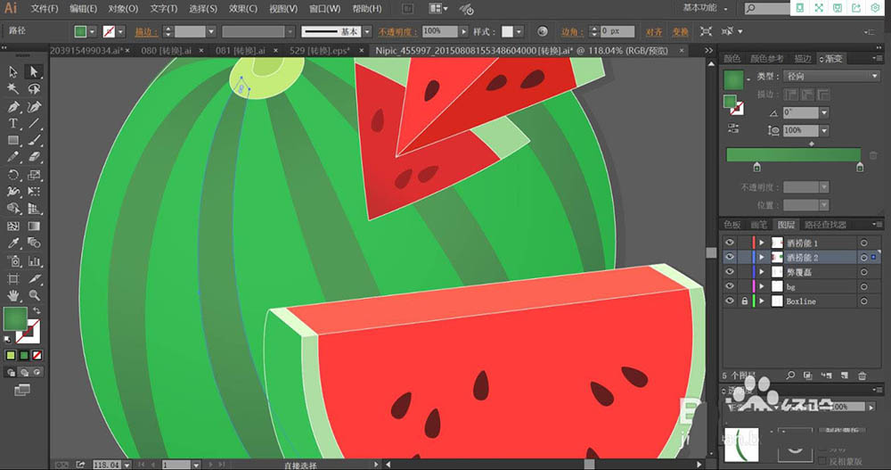 4、使用暗绿色的渐变填充西瓜的圆弧条纹,再用两种明度的红色分别填充切开西瓜的顶端与正面的路径,瓜子用暗红色填充。