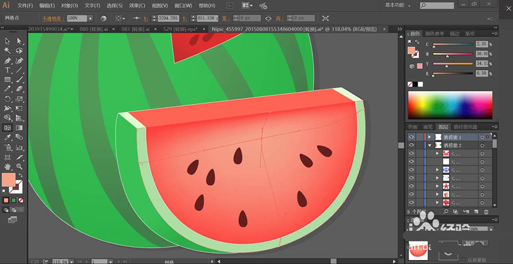 6、使用网格工具点击切开西瓜的亮光区域的中心让其呈现红色的渐变效果。