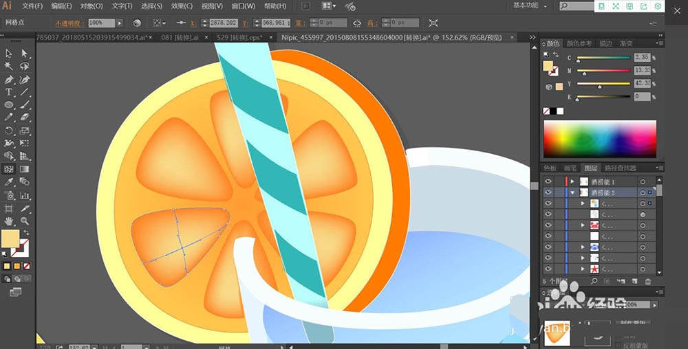 3、使用网格工具点击一下果肉的暗光路径让其呈现桔红色的渐变效果。吸管的路径用淡青色的渐变填充。
