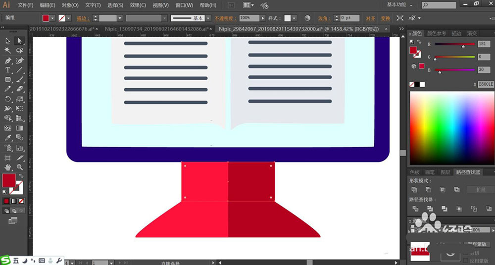 4、使用明暗两种品红色分别填充支架的左侧与右侧的路径,让左亮右暗的效果呈现。