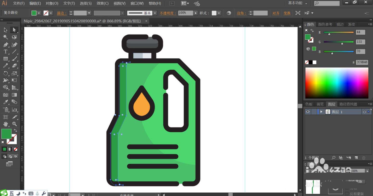 3、使用明暗两种绿色分别填充油桶的左侧与右侧,让左侧呈现暗绿,右侧呈现亮绿。