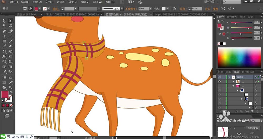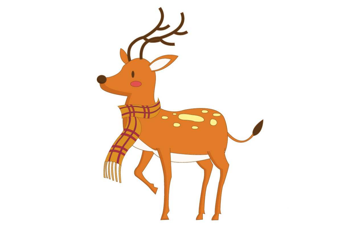 6、梅花鹿脖子上面的围巾使用橙黄色与品红色搭配填充主要与线条图案。