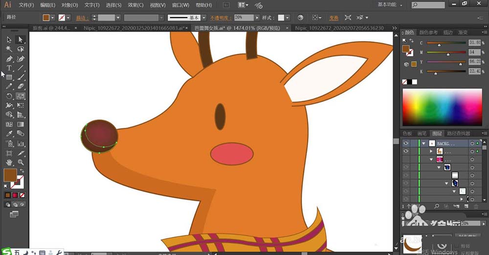 4、使用白色填充梅花鹿的耳朵内部,再用嫣红色填充梅花鹿的脸晕路径,眼晴使用红棕色填充。