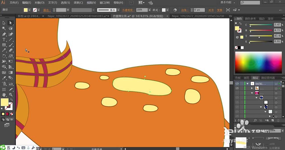 5、梅花鹿使用黄色填充背上的图案,再用黄褐色对于图案进行描边。梅花鹿的整个身体也用黄褐色进行描边让身体轮廓呈现出来。