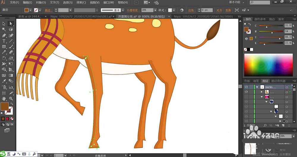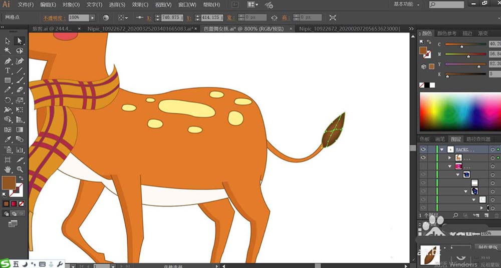 7、梅花鹿的尾巴使用红棕色填充末端,再用网格工具点击让其呈现渐变色,使用白色填充梅花鹿的肚皮下方,再用正片叠底的黄褐色填充腿部的左侧让其成为暗光效果,完成梅花鹿图片设计。