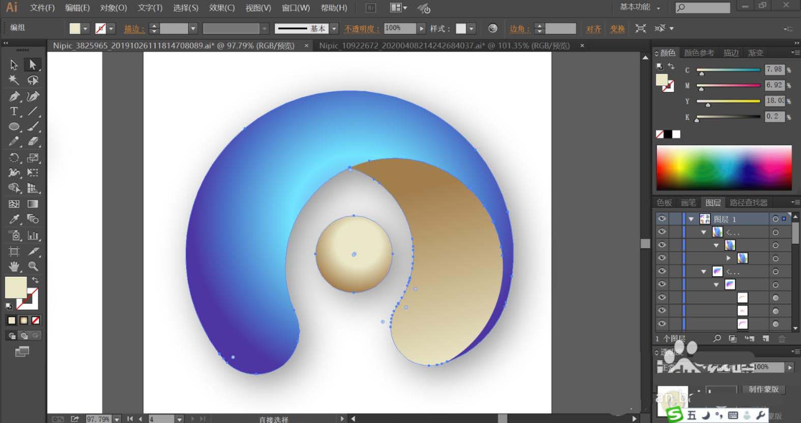 1、使用钢笔工具分别画出流线型的水滴的内外路径,再把不同的色彩区域用钢笔描绘出来,使用圆形工具画出图片当中的圆心路径,并复制到需要的其它位置。