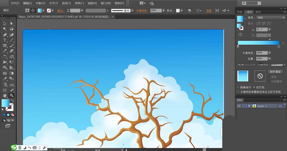 2、使用蓝色的渐变填充天空,让蓝色从上向下慢慢变淡,与云朵相交变成天蓝色。