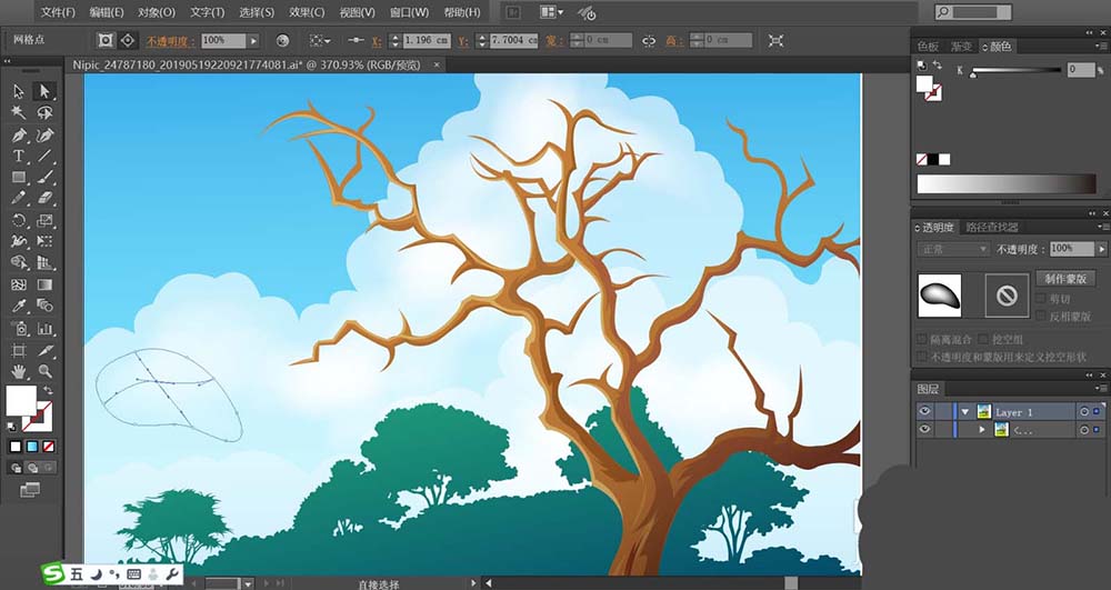 1、使用钢笔画出草地上面的大树轮廓,再画出大树上面的明暗光线路径,接着,我们画出远处树林的轮廓,再画出近处草丛的细节路径,最后用钢笔勾勒出天与云朵。