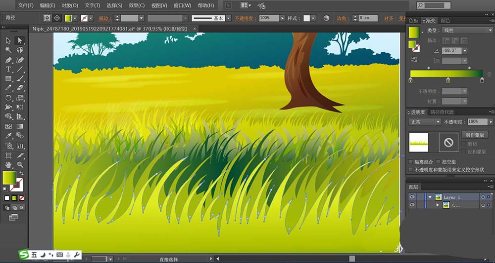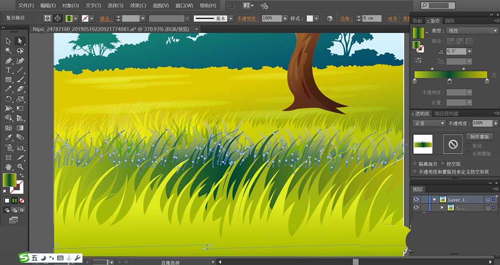 7、使用浅绿色的渐变与黄绿色的渐变分别填充近处的草丛路径,通过透明度与渐变色的改变让草丛的远近色调变化更丰富,完成草地风景画设计。