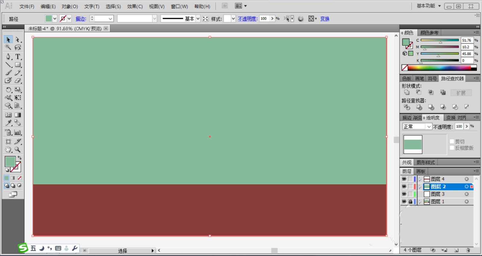 1、使用浅绿灰色与酒红色搭配分别填充墙壁与地面所在的矩形路径,再用钢笔画出墙壁左右两侧的挂绳与灯泡的路径。