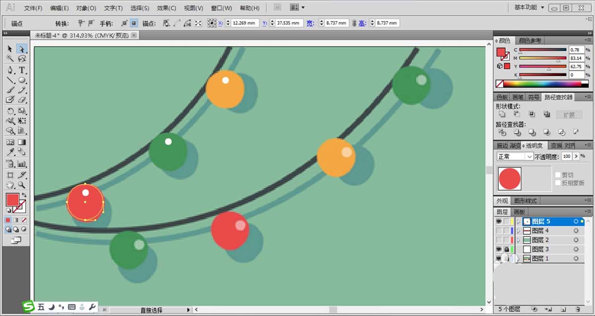 2、使用黑色填充挂绳,再用橙黄色、红色、绿色搭配填充挂绳上面的灯泡,灯泡的高光使用白色填充,灯泡所在的阴影使用正片叠底模式的绿色填充并放在灯泡的下面。