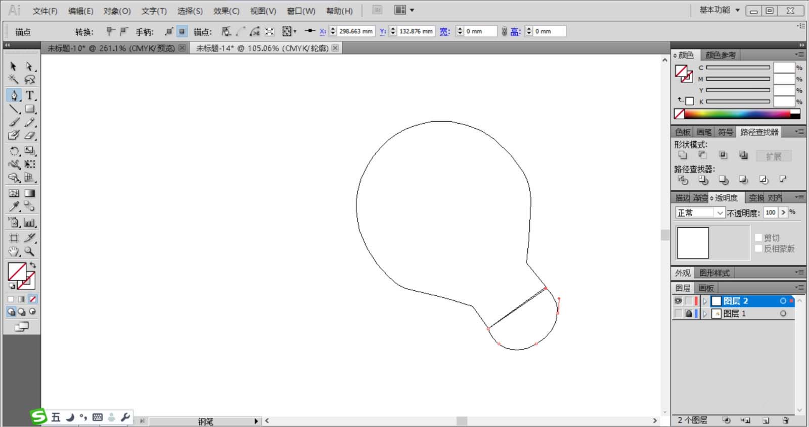 1、使用钢笔画出灯泡的上部结构,再画出下部的结构路径,在路径变化方向的位置设置不同的锚点,从而让路径的变化更加的自然。