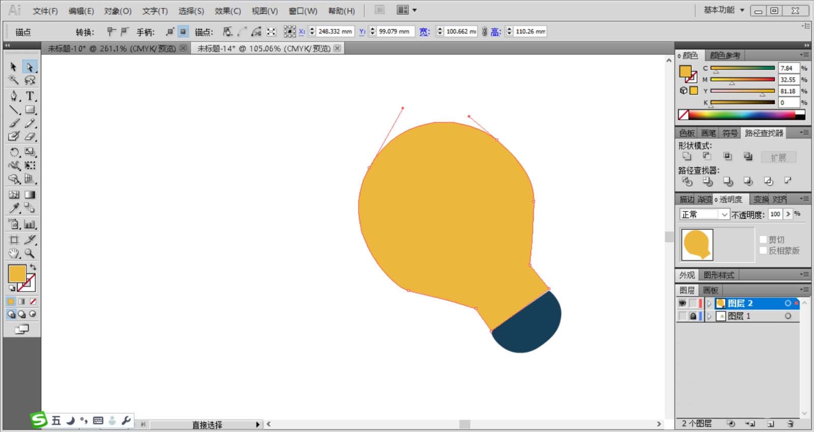 2、使用橙黄色填充灯泡的上部,再用蓝黑色填充灯泡的下部,接着,我们画出灯泡内部的灯芯的路径。