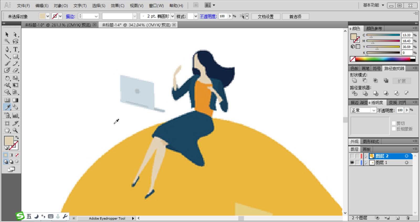 4、使用钢笔画出灯泡顶端的女子的动作路径,使用蓝黑色填充裙子与上衣,再用桔黄色填充内衣,使用黑色填充头发,再用粉色填充女子的手臂。笔记本使用天蓝色填充。