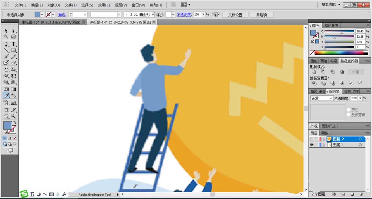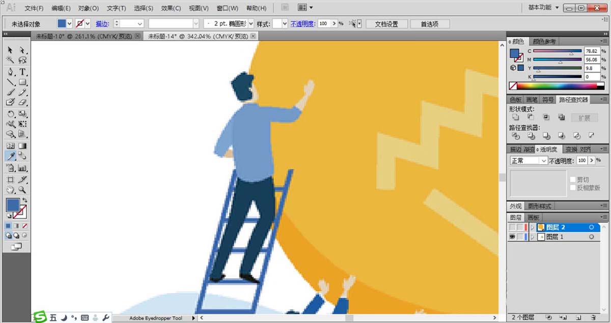6、使用直线工具画出长梯的路径,再用钢笔描绘出梯子上面的男子的身体动作路径,使用深蓝色填充梯子,再用蓝灰色与蓝黑色搭配填充男子的上衣与裤子。