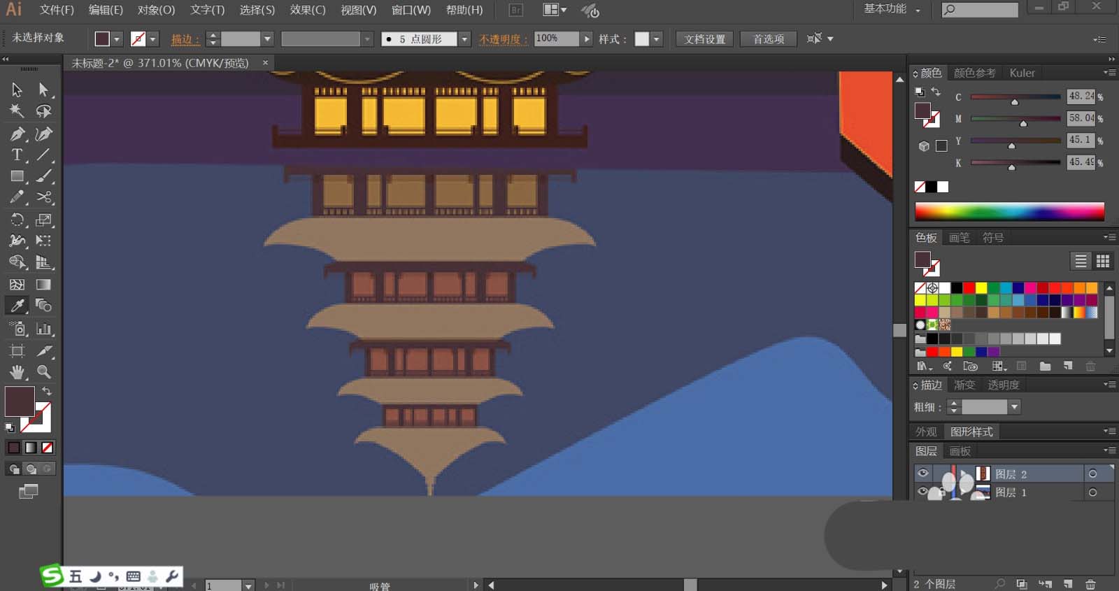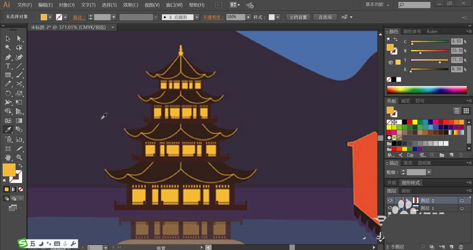 5、接着,我们使用钢笔画出宝塔的基本轮廓,再用黄色填充窗户,使用红棕色填充栏杆,再用灰黑色填充屋檐的路径。