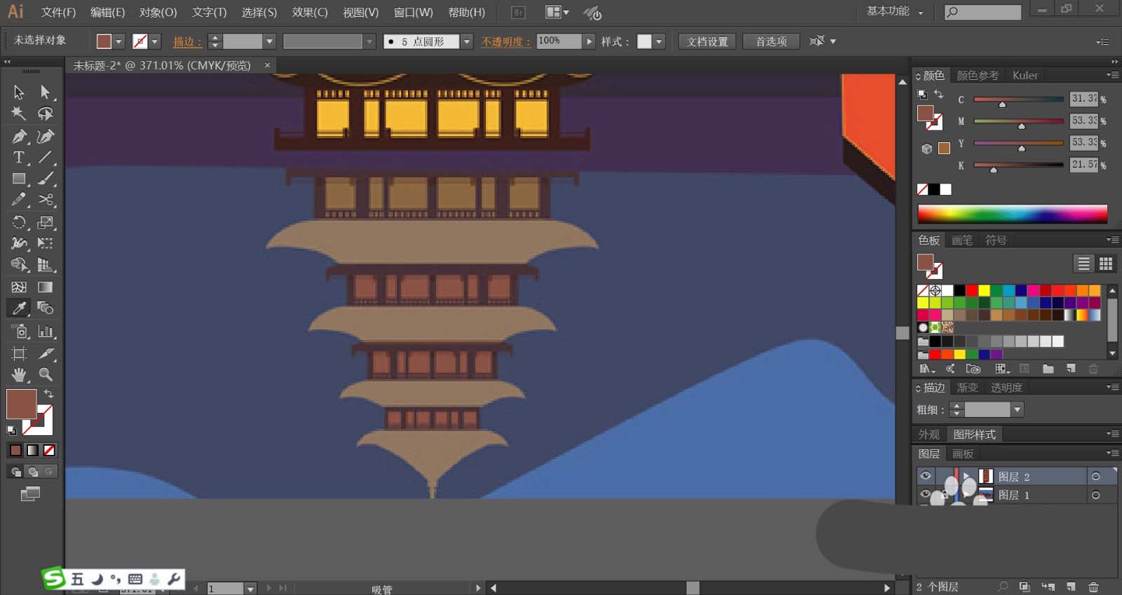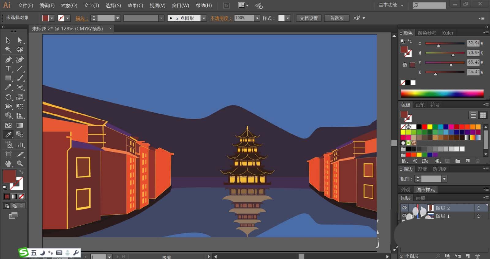 走在街上可以看到美丽的风景,想要记下来,回头使用ai绘制出来,该怎么画呢?今天,我们就来画一画街市美景,从中学习一下房屋与宝塔的画法,体会一下红棕色与桔红色、黄色、蓝色的搭配与使用,详细请看下文介绍。
