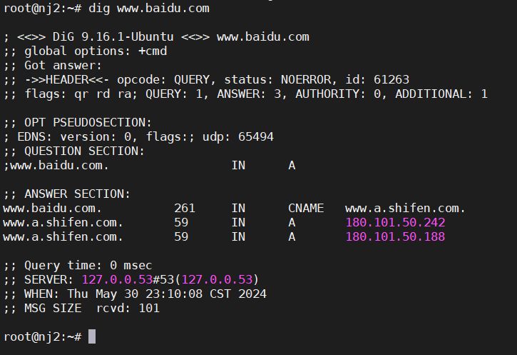 这将显示关于 www.baidu.com 的 DNS 信息,包括其 IP 地址。