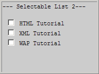 <?xml version="1.0"?> <!DOCTYPE wml PUBLIC "-//WAPFORUM//DTD WML 1.1//EN" "http://www.wapforum.org/DTD/wml_1.1.xml"> <wml> <card title="Selectable List 2"> <p> <select multiple="true"> <option value="htm">HTML Tutorial</option> <option value="xml">XML Tutorial</option> <option value="wap">WAP Tutorial</option> </select> </p> </card> </wml>