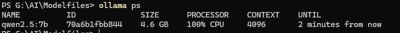 SIZE: 占用内存大小PROCESSOR:100% CPU: 表示模型完全在中央处理器上运行,没有使用显卡(GPU)加速。我的显卡的显存只有4GB。CONTEXT:上下文窗口大小。当前会话保留的“记忆”长度(Token 数量)。这个数字越大,占用的内存也越大。UNTIL(自动卸载倒计时):表示如果接下来没有任何人使用该模型,Ollama 将在 2 分钟后 自动把它从内存中卸载,以释放资源。