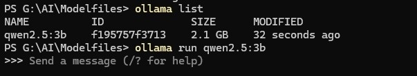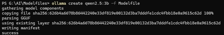 # 把 GGUF 文件打包成 Ollama 模型 ollama create qwen2.5:3b -f Modelfile # 或者用绝对路径 ollama create qwen2.5:3b -f G:\AI\Modelfiles\qwen2.5-3b\Modelfile