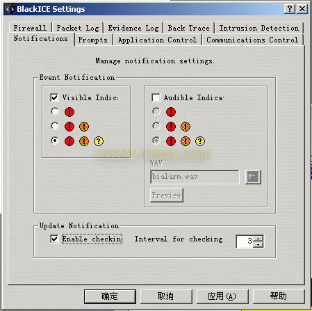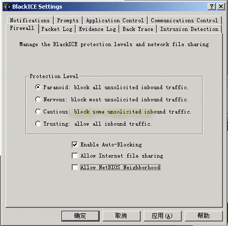 的“Enable Auto-Blocking”。如果你真的觉得他很讨厌的话,你可以考虑把前面的勾去掉,BlackIce将不再主动自动屏蔽,不过一般不建议这样做。同样,如果你选择了打开该选项,那么你就要有心理准备,在你没有预计的某个时候,你或者你的某个用户会被某个策略Auto-Block掉。