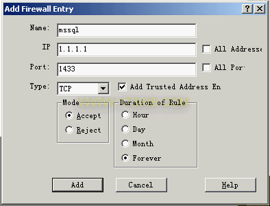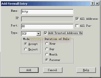 如果你需要允许某个IP段可以访问,你可以在“IP”设置里设置为“1.1.1.1-2.2.2.2”,端口段也一样。你也可以通过同样的设置禁止某个IP或者某个IP段禁止访问你的服务器,只需要在“All Addresse”选择你要屏蔽的IP,“Type”选择“IP”,“Mode”选择“Reject”,“Duration of Rule”选择你要屏蔽的时间就可以了。