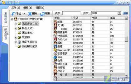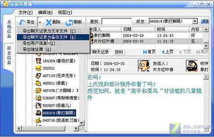(2)打开消息管理器后,先单击“我的好友”按钮,然后单击“我的好友”树型按钮,在出现的好友列表中选择其中需要备份资料的好友,然后单击工具栏上的“导出”图标,选择“导出聊天记录为备份文件”命令(如图2),弹出“另存为”对话框,选择好目标文件夹,输入备份文件名,单击“保存”按钮,导出完毕(如图3)。