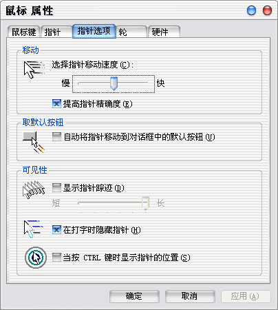 指针是对图案视觉的设置,指针选项则是对操作方面的设置,拖动“选择指针移动速度”上的滑块(图4),就能调节鼠标指针在屏幕上移动的速度。建议在“提高指针精确度”旁边的方框打上×号,这样有利于鼠标更精确地定位。