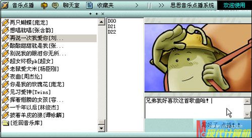 小马寝室的兄弟都将点播系统的客户端运行好了,他们点击工具条中的“音乐点播”,便看到了小马先前设置的歌曲类别,双击某个类别即可打开它,并且查看到所属类型下的歌曲列表,选中歌曲后,在右侧可以输入留言内容,写好后点击“写好了,点播!!”按钮(图4),在客户机的右下角便提示“点歌成功!谢谢使用!”。
