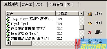 小马只要在自己电脑屏幕上的服务端窗口中,进入“点播列表”便可以查看到各位兄弟所点播的歌曲,以及是哪位兄弟点播的歌曲等信息(显示点播机的机器名),这些歌曲会自动依次序播放;如果想让某个兄弟点播的歌曲提前播放,小马只要选中该歌曲,然后点击“提前”按钮,便可以将其放到播放列表的最前端,如果选中歌曲并点击“播放”(图5),则立即播放所选歌曲而不按点播顺序。谁先谁后,小马有绝对的控制权,俨然是一个电台主播。^_^