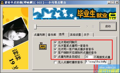 小马将下载的压缩文件解压缩到自己电脑的“D:\DIANGE\”文件夹下,然后进入“服务端”文件夹下,修改其中的Settings.ini文件内容,其中比较重要的设置如下:在[Skin]段落中将“Caption=”后面的文字修改为“小马哥点歌台”,然后将“[Config]”段落下“MediaType=”后修改为允许点播的歌曲类型(如:wmv,wma,vod,mpeg,mp3,midi,mid),将“IdlePath=”设置为自己电脑中存放歌曲的文件夹(如F:\song\),保存文件。