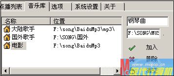 为了方便不同的兄弟点播不同类型的歌曲,小马切换到“音乐库”选项下,加入了“大陆歌手”和“国外景点音乐”两种类型,方法如下:在右侧上方的文本框中输入文字标识,在下方的文本框中输入歌曲所在路径,然后点击 “加入”(图3)。仿上还可以加入更多类别。