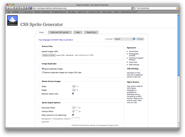 CSS Sprites 在显著降低 HTTP 请求方面功不可没,但 CSS sprite 可不是个简单的技术,Sprite generator 可以帮你做这些繁复的工作,将你的图片打包成 zip 上传上去,他们会把你的图片组合成 sprite,还帮你生成 CSS 代码。