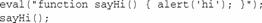 这里,函数sayHi()是在eval()调用内部定义的。因为该调用将被替换为真正的函数,所以仍可在接下来的一行中调用sayHi()。