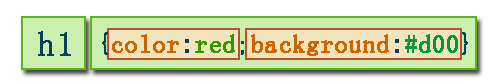 其中h1为选择器,color:red与background:#d00与声明,两者结合也即{}内称为声明块;color与background称为属性;red与#d00称为值。