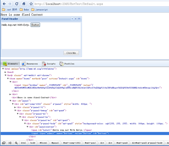 Panel还具有一个ContentEl属性,可以加载本页面上的dom节点。这种方法也能和asp.net服务器控件结合使用,对Default.aspx稍加修改: