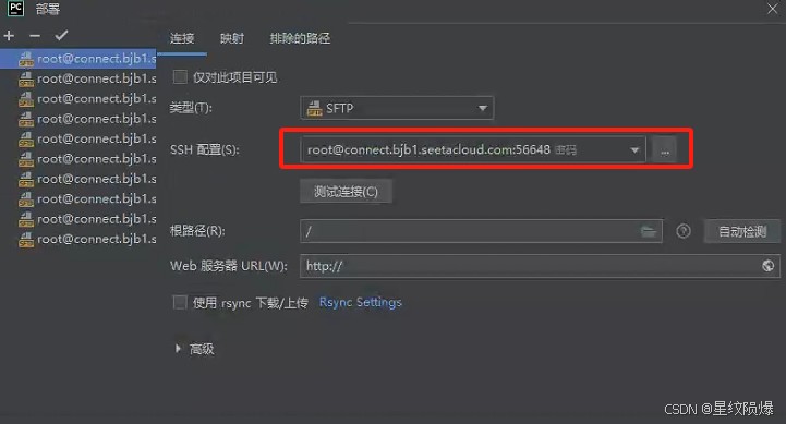 使用SSH配置服务器的连接,检测链接是否成功可以通过下方测试链接按钮来检查