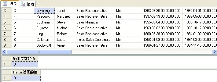 可以看出是通过EXEC @return_value = [dbo].[Employee] @Rowcount = @MyOutput OUTPUT中的return_value变量来获得返回值,而用MyOutput变量来获得了输出变量值,此处的MyOutput变量相当于引用传递!