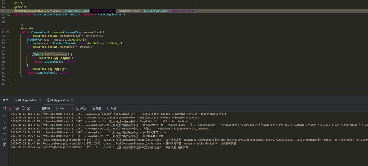 import com.example.mq.variable.RocketMQVariable; import lombok.extern.slf4j.Slf4j; import org.apache.rocketmq.client.annotation.RocketMQMessageListener; import org.apache.rocketmq.client.apis.consumer.ConsumeResult; import org.apache.rocketmq.client.apis.message.MessageView; import org.apache.rocketmq.client.core.RocketMQListener; import org.springframework.stereotype.Service; import java.nio.ByteBuffer; import java.nio.charset.StandardCharsets; import java.util.Objects; @Slf4j @Service @RocketMQMessageListener(topic = RocketMQVariable.TRANSACTION_TOPIC, consumerGroup = RocketMQVariable.TRANSACTION_GROUP) public class PushConsumerTransactionService implements RocketMQListener { @Override public ConsumeResult consume(MessageView messageView) { log.info("事务消息消费, messageView={}", messageView); ByteBuffer body = messageView.getBody(); String message = StandardCharsets.UTF_8.decode(body).toString(); log.info("事务消息消费, message={}", message); if (Objects.isNull(message)) { log.info("事务消息 消费失败"); return ConsumeResult.FAILURE; } log.info("事务消息 消费成功"); return ConsumeResult.SUCCESS; } }