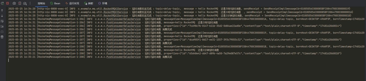 import com.alibaba.fastjson2.JSONObject; import com.example.mq.variable.RocketMQVariable; import lombok.extern.slf4j.Slf4j; import org.apache.rocketmq.client.annotation.RocketMQMessageListener; import org.apache.rocketmq.client.apis.consumer.ConsumeResult; import org.apache.rocketmq.client.apis.message.MessageView; import org.apache.rocketmq.client.core.RocketMQListener; import org.springframework.stereotype.Service; import java.nio.ByteBuffer; import java.nio.charset.StandardCharsets; import java.util.Map; import java.util.Objects; @Slf4j @Service @RocketMQMessageListener(topic = RocketMQVariable.DELAY_TOPIC, consumerGroup = RocketMQVariable.DELAY_GROUP) public class PushConsumerDelayService implements RocketMQListener { @Override public ConsumeResult consume(MessageView messageView) { log.info("定时/延时消息, messageView={}", messageView); ByteBuffer body = messageView.getBody(); String message = StandardCharsets.UTF_8.decode(body).toString(); log.info("定时/延时消息, message={}", message); Map<String, String> properties = messageView.getProperties(); log.info("定时/延时消息, properties={}", JSONObject.toJSONString(properties)); if (Objects.nonNull(messageView.getProperties().get("OrderId"))) { log.info("定时/延时消息, message={}", messageView); return ConsumeResult.FAILURE; } log.info("定时/延时消息 消费完成"); return ConsumeResult.SUCCESS; } }